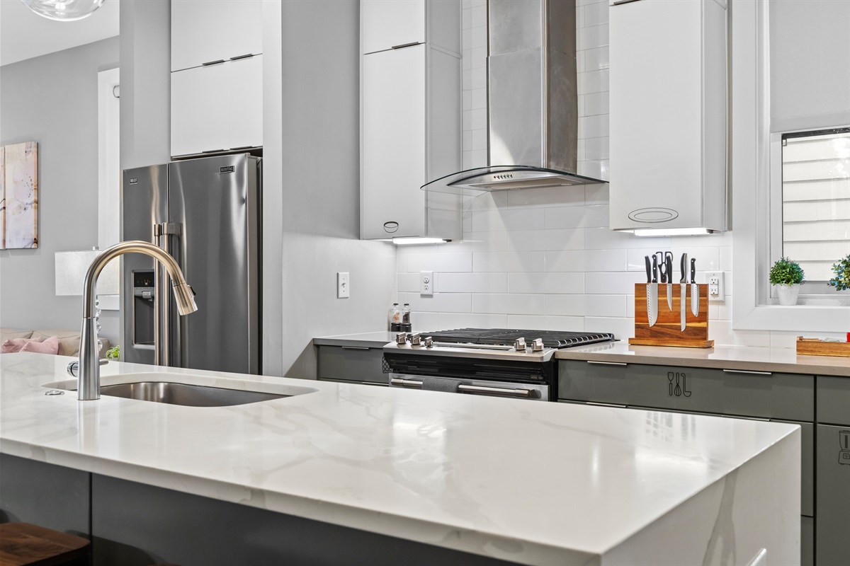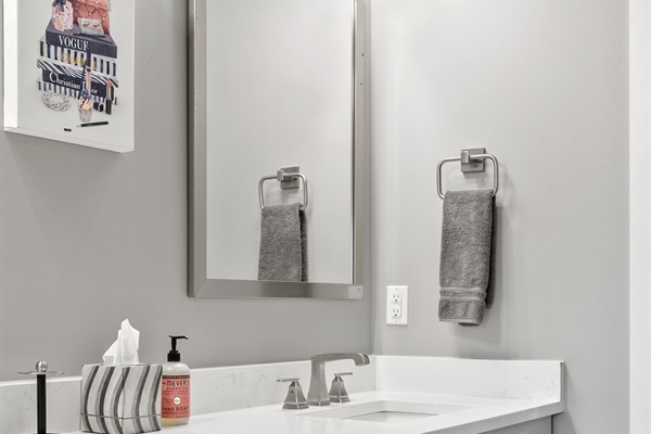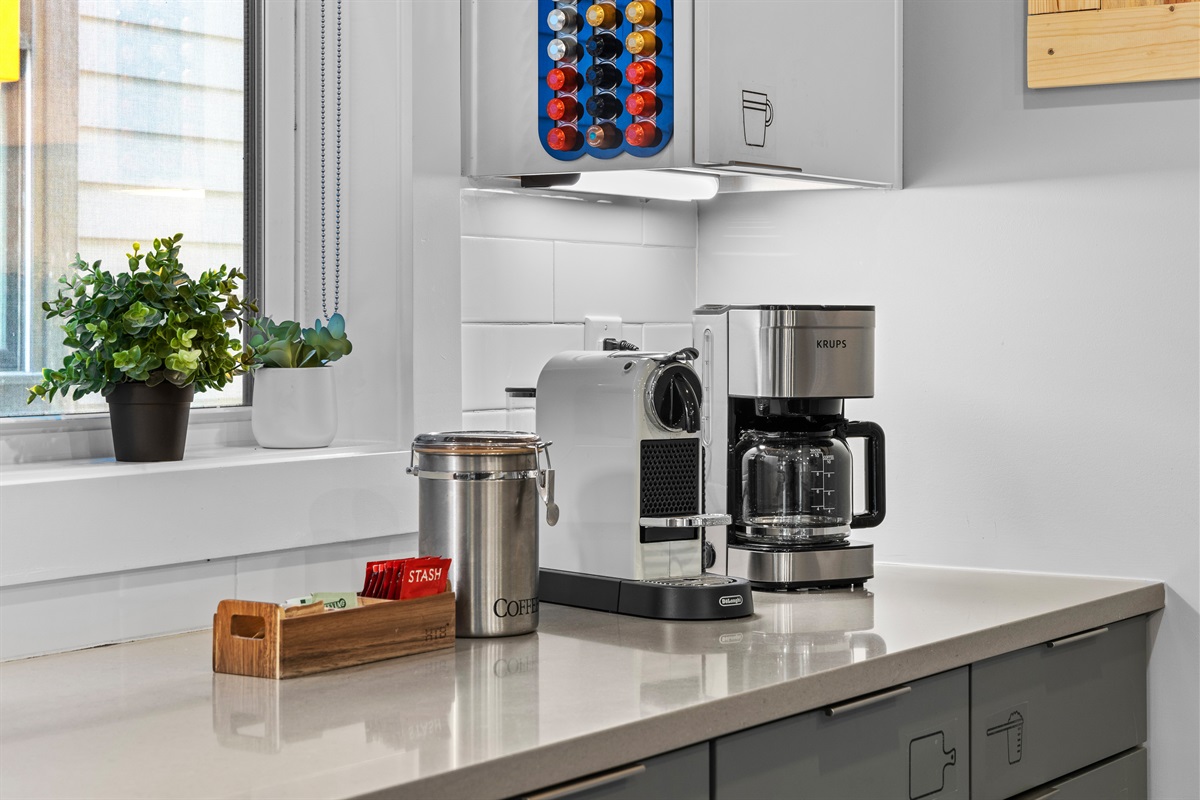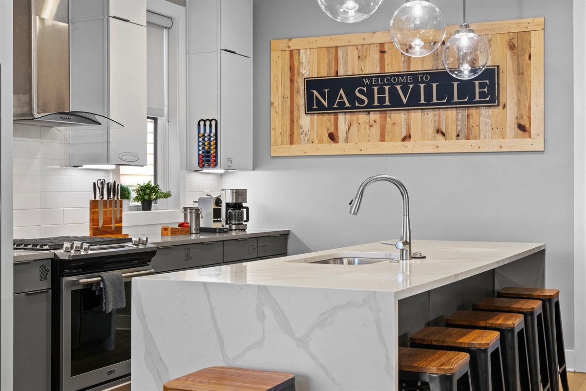 The kitchen is fully equipped for real cooking and casual meals alike. Whether you’re prepping a group brunch, ordering in after a night out, or just enjoying coffee before the day begins, the open layout makes it easy to stay connected while you cook or serve. Sleek appliances, ample counter space, and a stocked coffee bar add to the convenience.