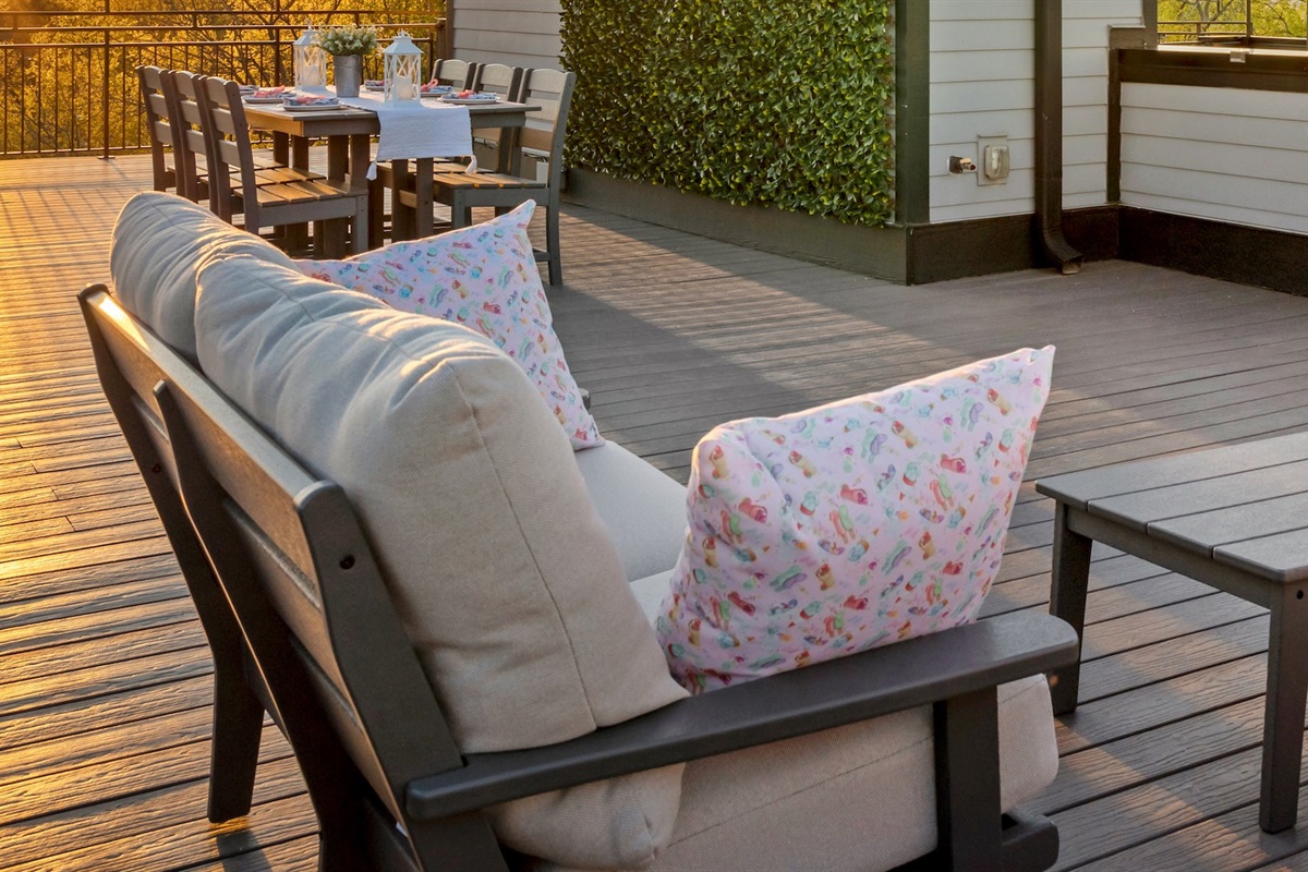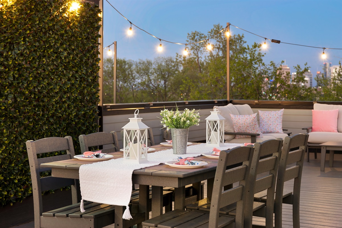 The rooftop terrace is one of the home’s most-loved features. With sweeping skyline views, soft seating, and space for both celebration and stillness, it invites everything from morning coffee to golden-hour cocktails. It’s also a perfect place for group photos and relaxed gatherings under the sky.